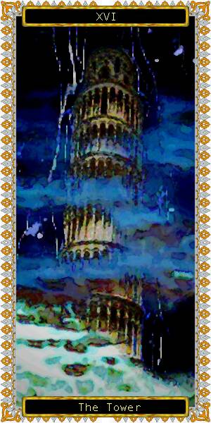 「塔」のカードには、通常、真ん中に描かれた塔に雷が落ち、塔から投げ出された男性2人が落ちていく様子が描かれます。バベルの塔の神話が、人間のおごりに怒る神をあらわすのと同じように,この塔のカードも富や権力は無力であるということを意味し、「困難や崩壊、失敗や物事の終局」をあらわすカードです。